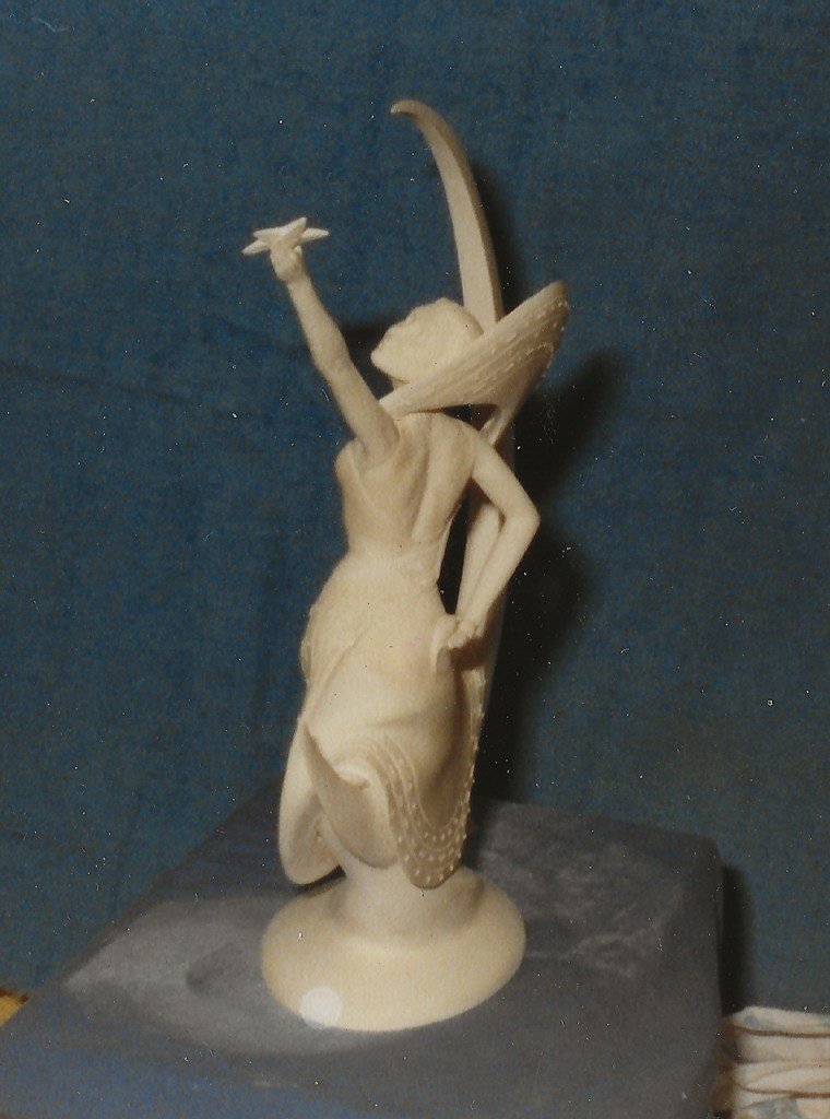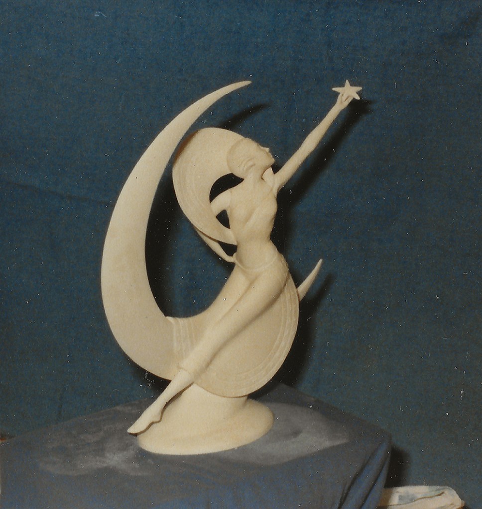 Above: the ad that appeared in numerous consumer magazines through the late 1980s and 1990s. Moonlight In Platinum became one of the most successful figurines of all time for The Franklin Mint, with reportedly about $40 million in gross sales! When Victoria Oldham went to Thailand in 1995 to instruct a group of china painters on another figurine project, she met with one factory owner during her visit who claimed to have made eleven million dollars in profits in manufacturing sales of this figurine — at only one of his several factories. Sadly, figurine sculptors like the Oldhams were shamefully underpaid in those days, Victoria having received a mere $2500 for the design sold to the Franklin Mint in 1987—with no royalties. Of course, in hindsight, it was akin to highway robbery, but all the sculptors we knew were treated similarly. The Franklin Mint added more figurines to their new Art Deco-style line, but Victoria was not to be designer of the follow-ups; the Oldhams quit working with the Franklin Mint within 1-1/2 years of creating several highly successful work-for-hire designs, due to many issues related to mistreatment of the sculptors.
